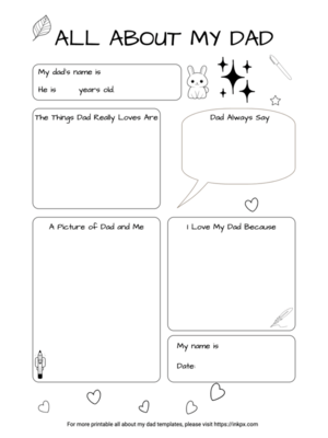 An All About My Dad template is a printable activity sheet designed for children to fill out and share fun, loving, or thoughtful facts about their dad. These templates are often used for Father's Day, birthdays, or just as a sweet surprise to show appreciation. They create a meaningful keepsake that dads can cherish for years to come. Templates are available in ready-to-download PDF, PNG, and JPG formats, with optional customization for text, fonts, and colors.