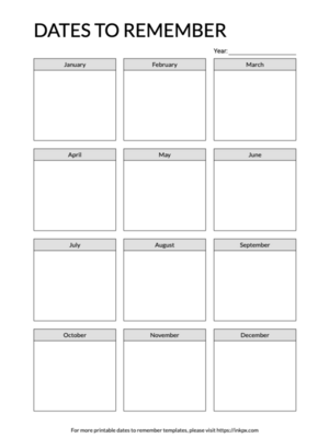 A dates to remember template is a printable sheet designed to help you keep track of important dates throughout the year. It serves as a simple yet effective reminder tool for birthdays, anniversaries, appointments, and other meaningful events. These templates are good for home, school, or office use, offering a clear layout that makes it easy to view and organize dates at a glance. Available in A4 and US Letter sizes, they can be downloaded in PDF, PNG, or JPG formats, with optional customization for fonts, colors, and text.