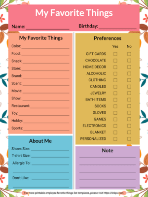 An employee favorite things list template is a simple, printable form used to collect personal preferences from team members. It helps managers, colleagues, and HR teams learn more about each employee's likes and interests. Whether for birthdays, work anniversaries, appreciation events, or team bonding, this tool makes it easier to give meaningful and personalized gifts. Available in downloadable PDF, PNG, and JPG formats, the templates come in A4 and US Letter sizes and offer optional customization for fonts, colors, and text.