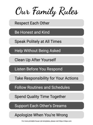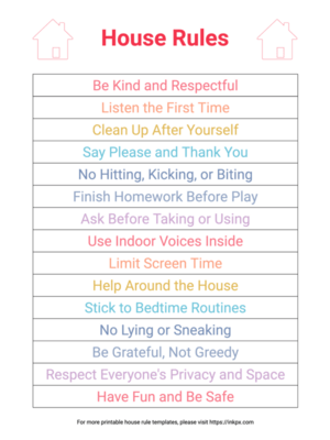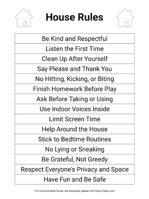 A house rule template is a printable document designed to clearly outline the rules and expectations within a household. These templates help promote structure, consistency, and harmony by providing a visible reminder of agreed-upon behaviors. Whether for kids, shared living spaces, or family agreements, a house rule template makes it easier to establish boundaries and encourage accountability. With customizable options, you can tailor each template to suit your home's unique needs.