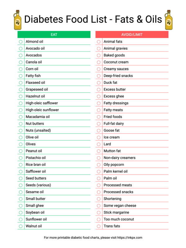 Free Printable Colorful Diabetes Food List - Fats & Oils