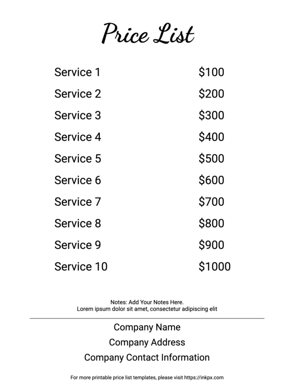 Free Printable Editable Minimalist Pure Text Price List Template