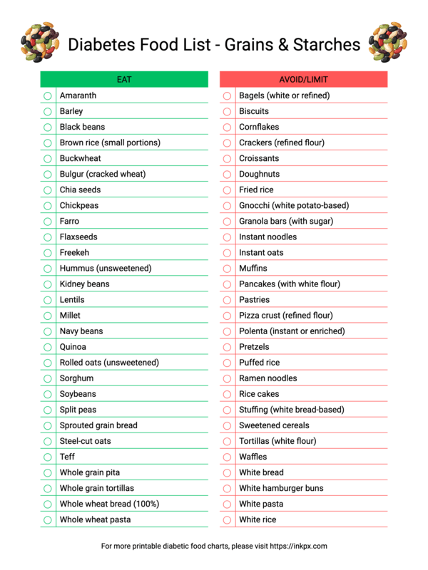 Free Printable Colorful Diabetes Food List - Grains and Starches
