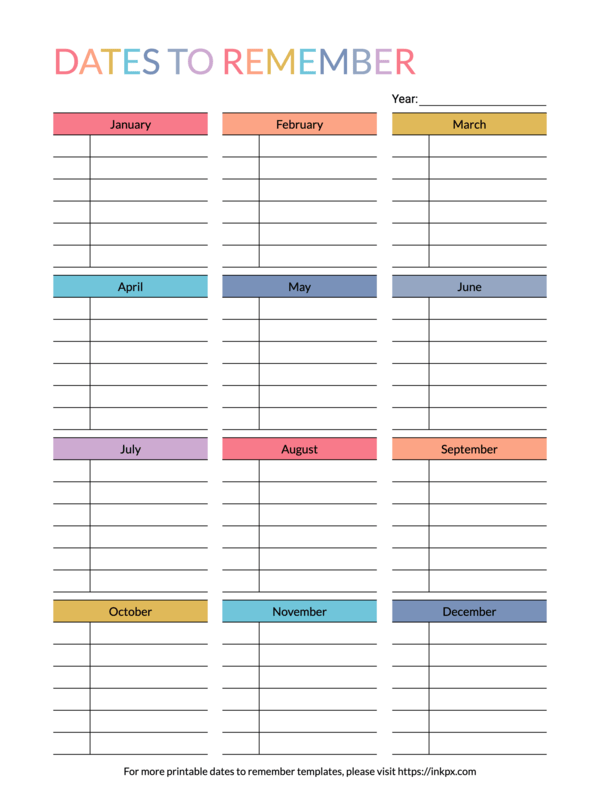 Free Printable Colorful Table Style Dates to Remember Template
